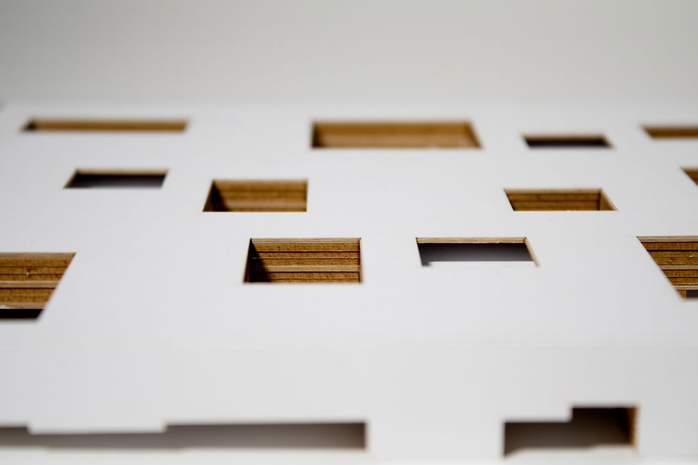 Above, the modulated floor mirrors these programmes, generating variation in otherwise similar homes. Each dwelling combines a compressed entrance with a generous living area, oriented both inward and outward to balance retreat with openness to the landscape.