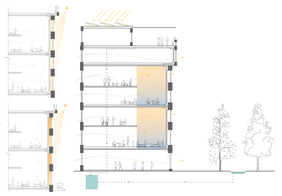 Two planar canopies anchor the project: one integrates greenery, transport, and sheltered event areas at the square’s edge; the other crowns the building, framing panoramic views and offering a rooftop terrace. Flexible interiors and revitalised underground spaces host workshops and activities, transforming the square and building into a cultural and social catalyst for Kharkiv’s future.